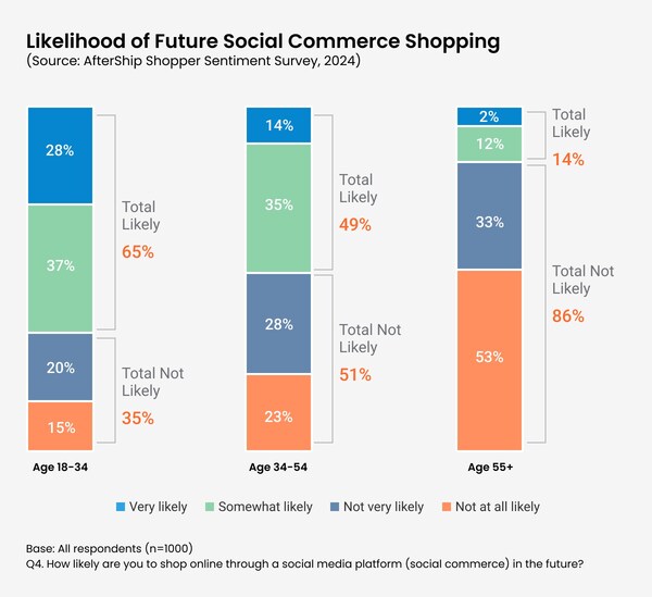 AfterShip's Shopper Sentiment Report reveals that younger generations are more likely to shop online through a social media platform in the future. This percentage is the highest in the 18 to 34 age category.