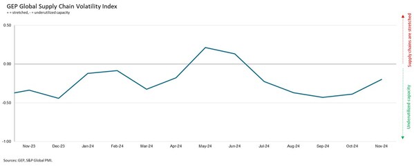 CLARK,N.J.,Dec. 16,2024 --The GEP Global Supply Chain Volatility Index— a leading indicator tracking demand conditions,shortages,transportation costs,inventories and backlogs based on a monthly survey of 27,000 businesses — signaled the smallest level of spare capacity in global supply chains since June in November,as the index rose to -0.20,from -0.39 previously.