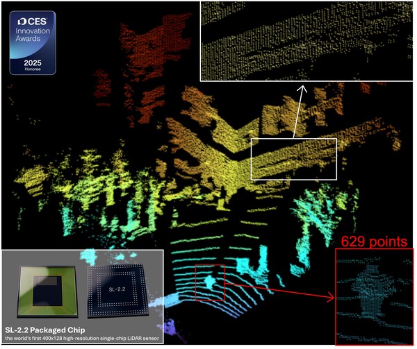 SOLiDVUE’s LiDAR sensor chip,SL-2.2,and demonstration images (Photo=SOLiDVUE)